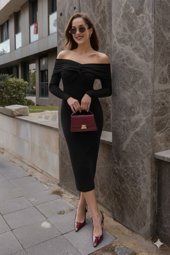 Kadın uzun kollu madonna yaka düğüm büzgü detay maxi boy elblbise