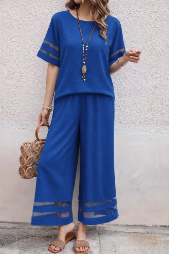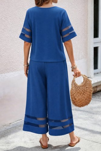 • Kadın kısa kollu bisiklet yakalı tül şerit detaylı bluz ve pantolon ikili takım