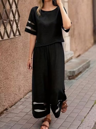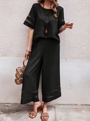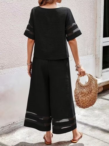 • Kadın kısa kollu bisiklet yakalı tül şerit detaylı bluz ve pantolon ikili takım